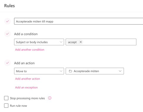 den 25 september 2025 Lägga accepterade möten till specifik mapp Om du är trött på att leta efter de möten du accepterat som hamnar i papperskorgen, med denna regel i Outlook får du alla till en mapp. Lättare att hitta, det kallar vi krångelfritt!