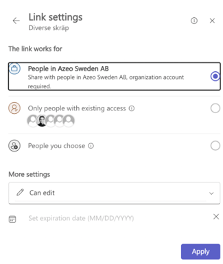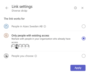 Att välja Only people with existing access innebär inte att alla i ett Team får åtkomst automatiskt. Det innebär bara att de som redan har åtkomst, oavsett om de är i teamet eller inte, kan använda länken.