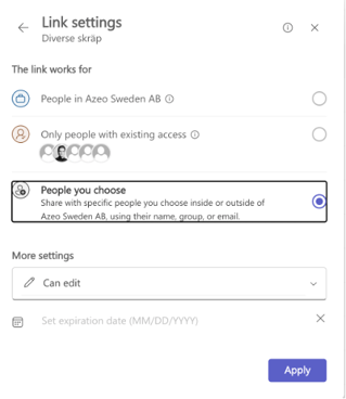 Vill man tilldela till någon som inte är medlem i teamet men ändå vill ge någon access så väljer man ”People you choose” då funkar den länken bara för den du väljer